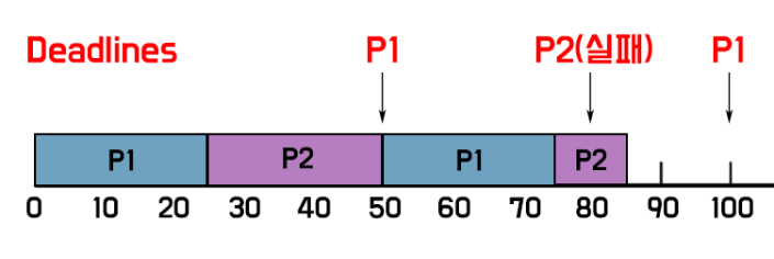 위의 경우를 보면, P1이 P2보다 rate가 높으므로 priority가 높은 것을 확인할수 있다. 그래서 P1 먼저 실행되고, P2가 실행되다가 50초에 다시 P1이 스케줄링된다. 75초에 다시 P2가 스케줄링 되고있는데, 80초에 첫번째 P2 스케줄링이 끝나기 전에 다시 P2가 스케줄링된다. 이 경우, deadline을 맞추는데 실패한 것이다. (펑)