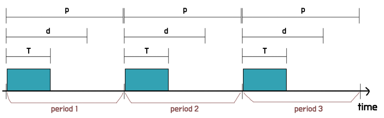 Real-time system에서 특정 프로세스가 주기를 가지고 반복적으로 들어온다고 생각해보자. 이때 주기를 p, deadline을 d, 프로세싱되는 시간을 T라고 하면, 아래의 그림이 성립된다. (0 <= T <= d <= p)