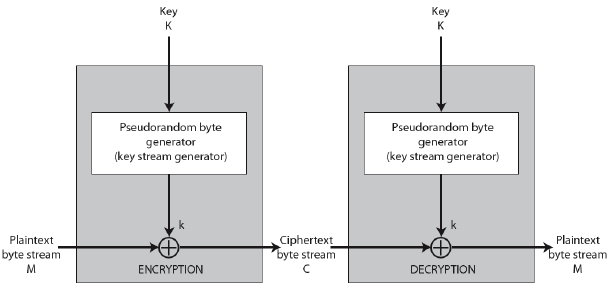 주로 위의 그림과 같이 유사난수를 1비트 단위로 생성하고, 암호화하려는 데이터와 XOR하여 1비트의 암호문을 얻는 식으로 많이 사용된다.