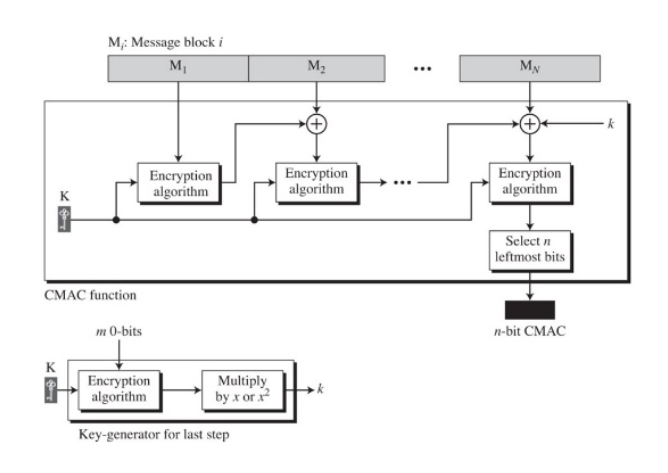 CMAC에서는 메시지 암호화 과정에서 나온 결과물을 MAC으로 사용한다. CMAC의 과정을 나타낸 그림은 아래와 같다.