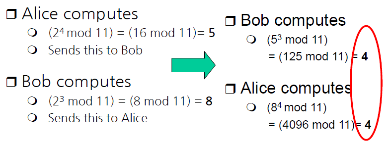 이제, Alice와 Bob은 N,g 그리고 자신의 비밀키로 계산하여 결과값 5, 8을 얻는다.