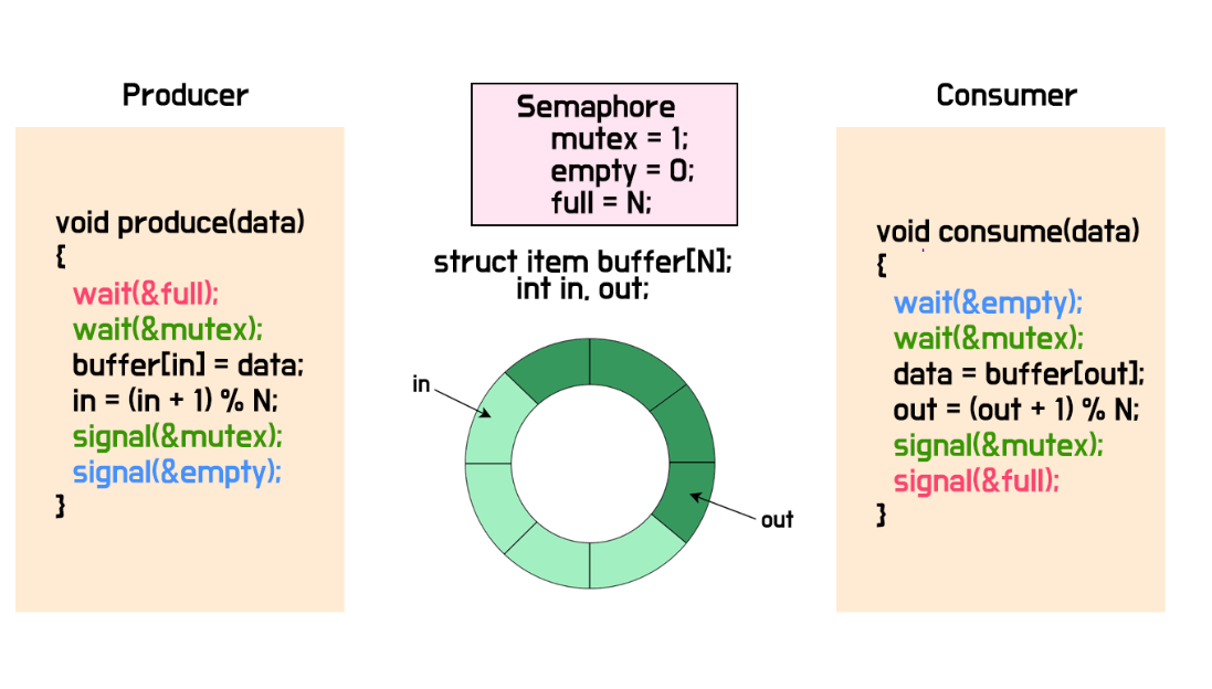 - Mutex = 1, empty = 0, full = N 로 해놓고 semaphore설정한다.
