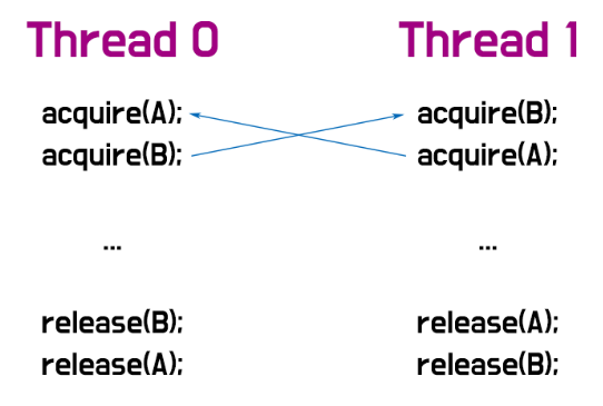 쓰레드0은 B가 풀릴때까지 A를 잡고있을 것이고, 쓰레드1은 A가 풀릴때까지 B를 잡고있을 것이다. 결국 서로 아무런 진행도 하지 못한 채, 오도가도 못하는 상황에 빠지게 되는데 이것이 바로 데드락이다.