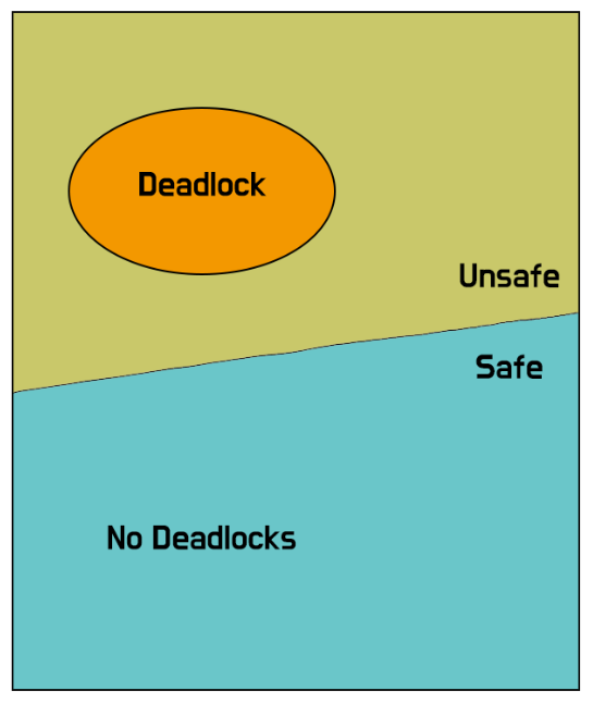 위의 그림에서 알 수 있듯이, 데드락은 Unsafe한 구간에서만 발생한다. 즉, 데드락을 피하고 싶으면, Safe한 구간에만 리소스를 할당해주면 되는 것이다.