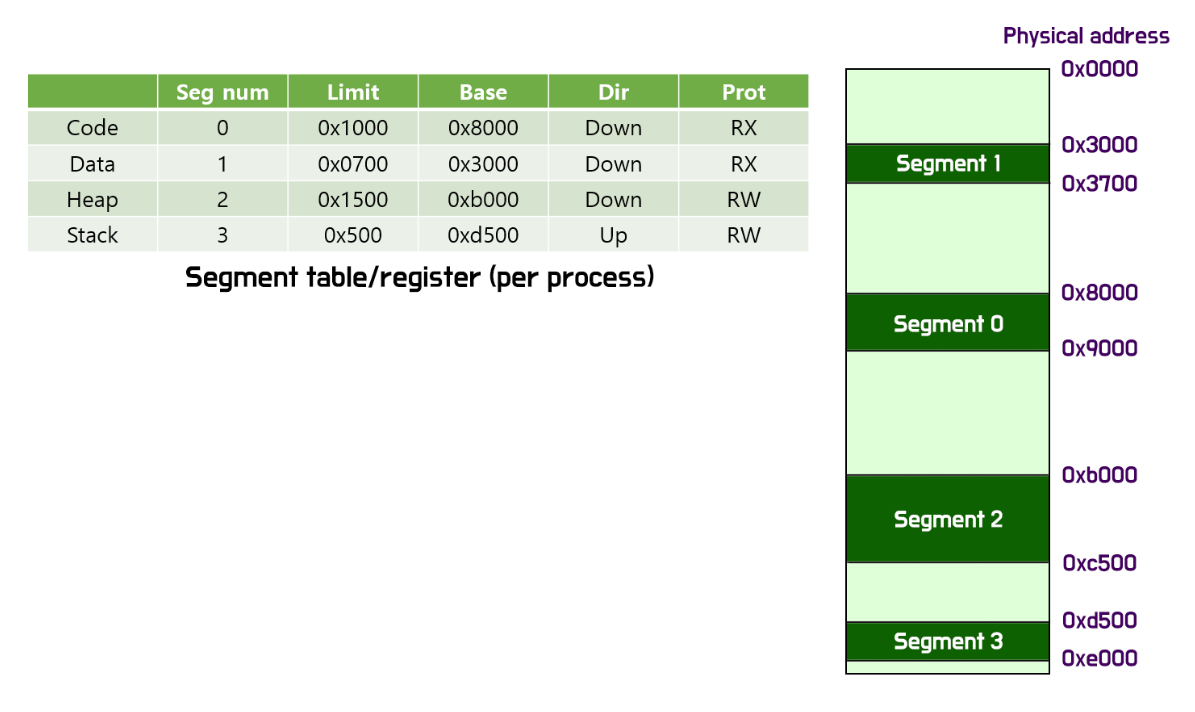각각의 segment는 segment table을 가지므로, 이를 통해 PA에 매핑시킨다. table에는 DIR라는 값도 있는데, 이는 앞으로 segment가 늘어날 방향을 알려주는 값이다.