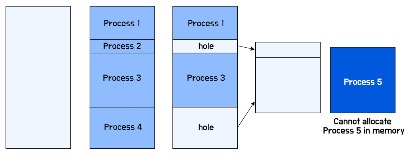 external fragmentation이란 프로세스가 address space 를 쓰고 반환하면, hole이 생기는데, 각 hole들을 합쳐서다른 프로세스에게 할당해주기 어렵다는 문제이다.