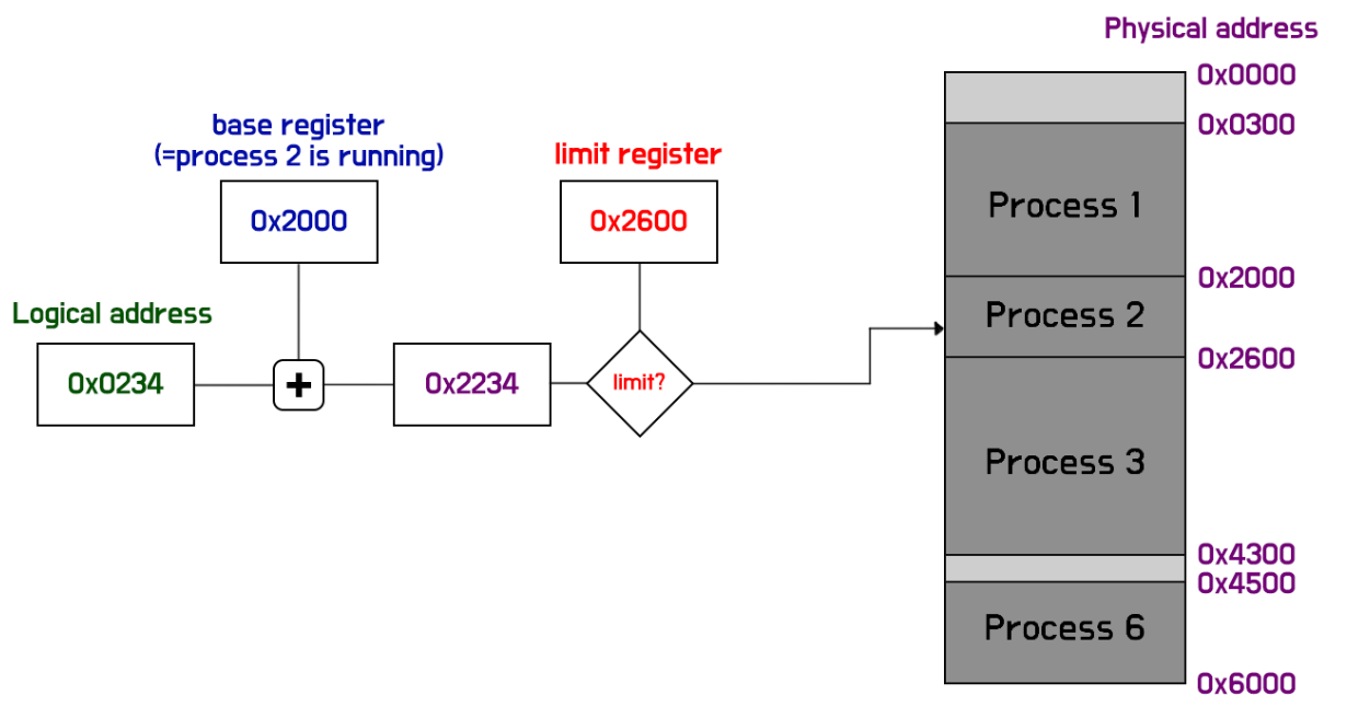 PA = Base Address + LA이긴 한데, Limit register가 존재하여, PA가 Limit register 안쪽으로 떨어져야 유효하다.
