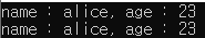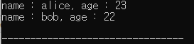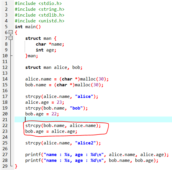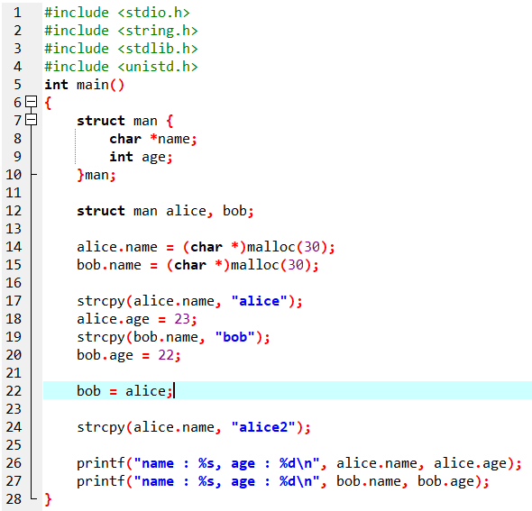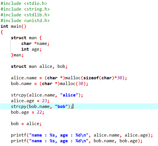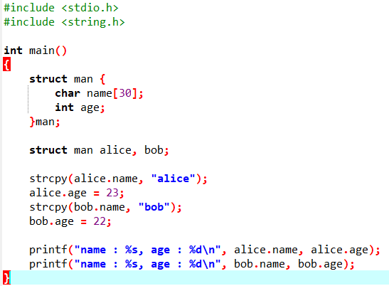 위의 코드는 name이라는 문자열과 age라는 정수변수를 가지고 있는 man이라는 구조체를 만들고, alice와 bob이라는 man구조체에 값들을 할당한 코드이다. 위 코드를 실행해보면
