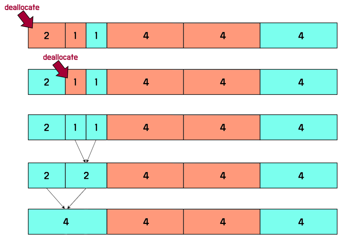 2) 자신의 buddy가 할당되어 있지 않으면(free) 자신의 buddy와 합쳐져 하나의 chunk가 된 후 반환한다.