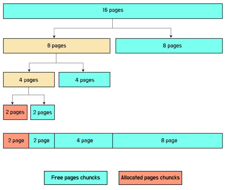 이 때, 그냥 랜덤하게 2개의 페이지를 주는 것이 아니라, 자신의 페이지를 반으로 잘라서 8개의 페이지 두개를 만들고, 또다시 반으로 잘라서 4개의 페이지 두개를 만들고, 또다시 반으로 잘라서 2개의 페이지 두개를 만든다. 이제 2개의 페이지가 만들어졌으므로 이 2개의 페이지를 할당해주면 된다.