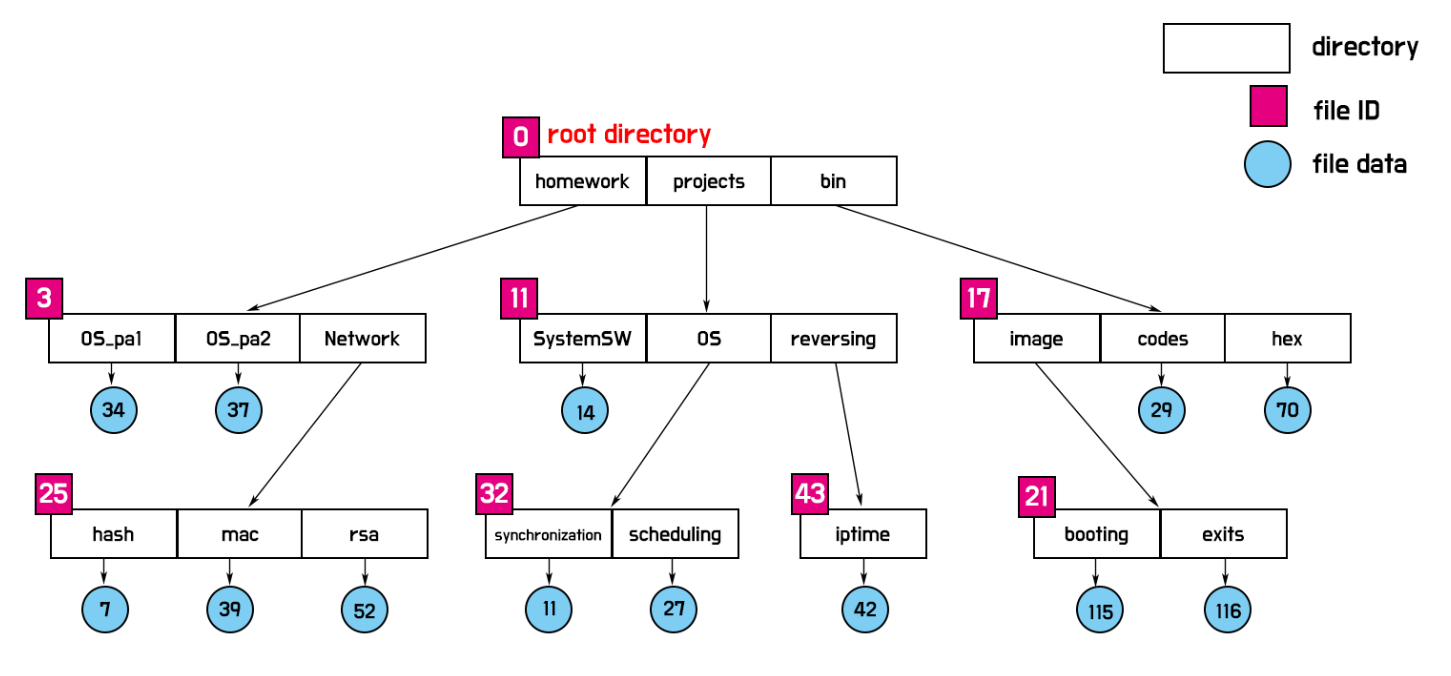 하지만 디렉토리는 단순히 파일과 디렉토리를 nesting 하는데 그치지 않고, 자신이 가진 파일과 디렉토리의 metadata 또한 가지고 있다. metadata란, 특정 데이터를 설명해주는 데이터이다. 예를 들면 특정 파일의 생성시간, 파일이름 등을 담은 정보가 그 파일의 metadata 이다. 위의 그림에서 디렉토리들은 file ID를 가지고 있는데, file ID 또한 metadata의 일종이다.