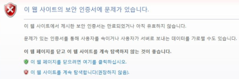 웹서핑을 하다보면 위와같은 창이 가끔씩 나오는데, 이는 웹사이트가 서버 인증서를 갱신하지 않았거나 잘못된 서버인증서를 제시했기 때문에 발생하는 문제이다.