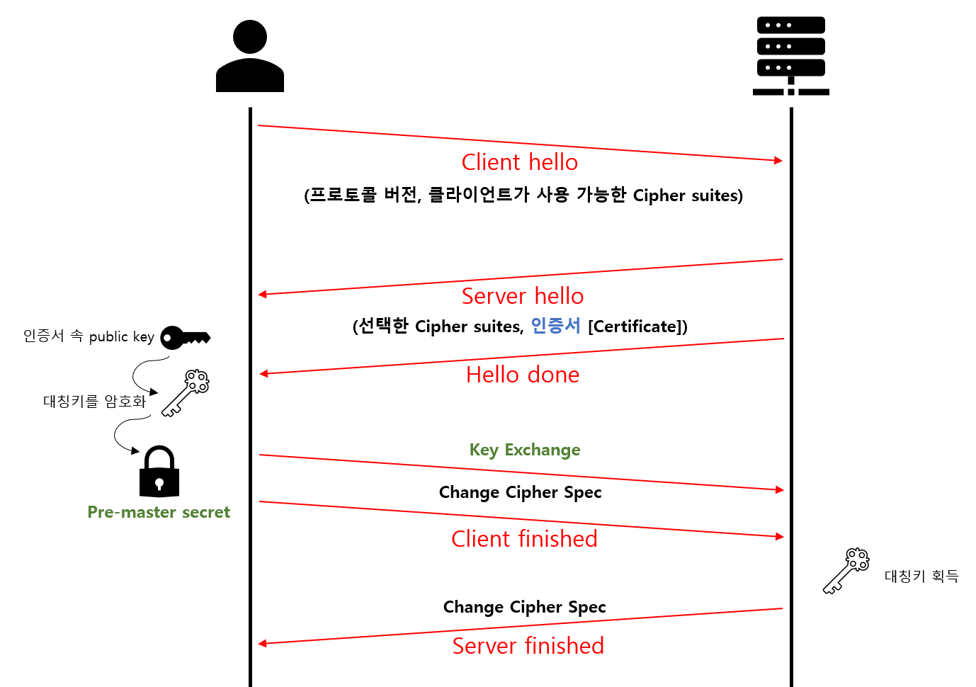 (4) 클라이언트가 앞으로 서버와 통신할 때 사용할 세션키(대칭키)를 서버의 공개키로 암호화하여 서버에 보낸다. 이때 서버의 공개키로 암호화된 세션키를 pre master secret 라고 부른다.
