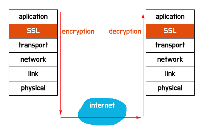 위의 그림에서 알 수 있듯이 SSL은 application layer와 transport layer의 사이에 위치해있다. application layer가 데이터를 SSL에게 보내주면, SSL은 이 데이터를 암호화하여 transport layer로 보내주는 중간다리 역할을 한다.