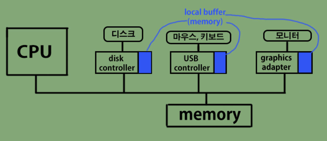 또 다른 예시로, 만약 CPU가 디스크에게 '너 디스크에 입력된 내용좀 읽어봐' 라고 지시했을 때, 디스크는 자신의 데이터를 읽고, 읽은 데이터를 controller의 local buffer에 저장하고 CPU 에게 interrupt를 보낸다.