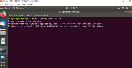 위의 그림은 호스트 컴퓨터에서 tcpdump를 실행시킨 모습이다. 우리는 telnet 관련 패킷만 분석하면 되므로, 포트는 23번(telnet 포트번호) 옵션을 켜준 것을 확인할 수 있다.