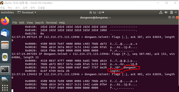 다른 클라이언트가 호스트 컴퓨터에 telnet으로 로그인을 시도하는 경우, telnet 패킷을 분석하여 로그인 정보 알아내기