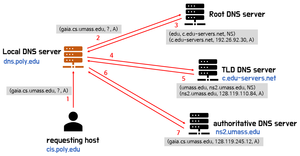 4) Local DNS 서버는 umass.edu에 해당하는 DNS 서버에게 쿼리를 날리고, 해당 DNS 서버는 gaia.cs.umass.edu에 해당하는 IP 주소를 알려준다. 즉, umass.edu를 책임지는 DNS 서버가 authoritative name 서버인 것이다.