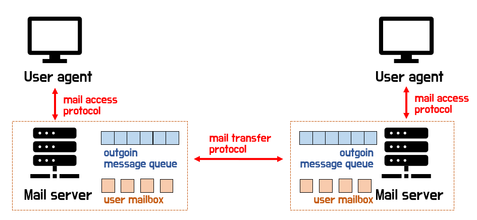 간단하게 정리하면, user agent와 mail server 사이에서는 Mail access protocol이 사용되고,