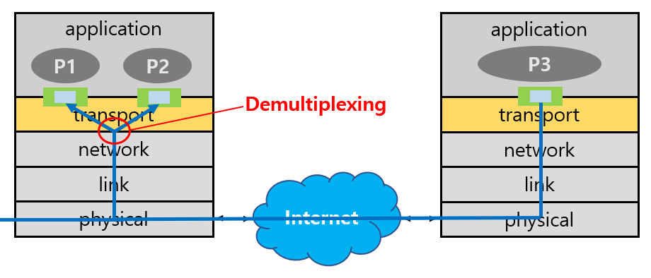 하위 레이어로부터 수신된 패킷을 올바른 Socket으로 전송하여 올바른 어플리케이션에게 전송하는 것.