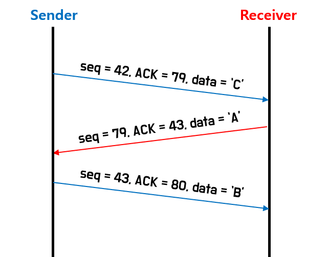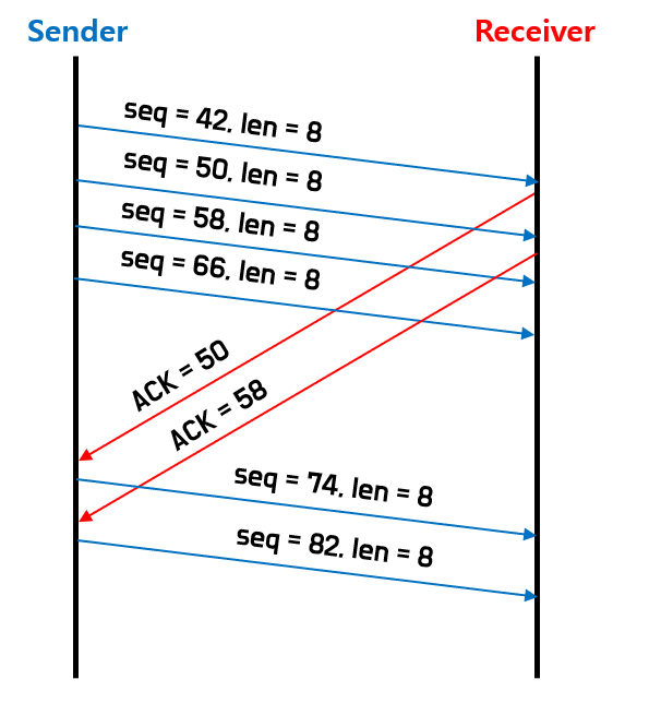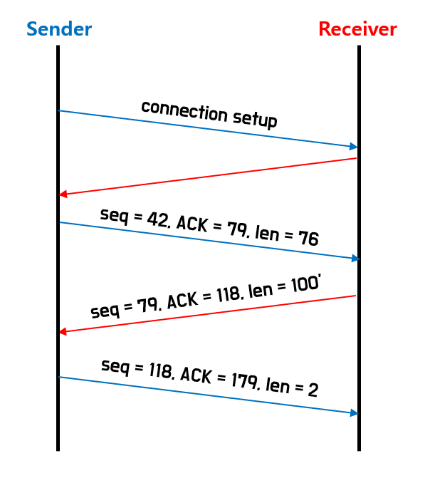 만약 하나의 패킷(segment)의 크기가 8bytes 라면, sequence nubmer는 1, 9, 17, 25, ... 이런 식으로 증가하는 것이다.