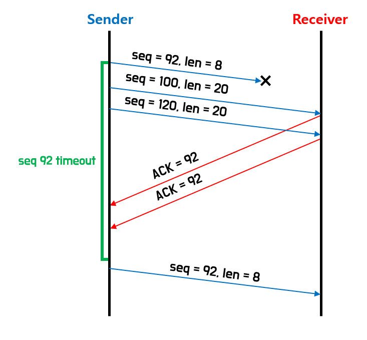 만약 유실이 된 것으로 의심이 되면, 빠르게 재전송을 해야 하는데, 타이머의 timeout을 기다리는 것은 굉장히 답답하다. 왜냐하면, TCP의 경우 타이머를 window에서 가장 베이스가 되는 패킷에 하나만 설정해놓기 때문이다. 따라서 한번에 여러 패킷을 보냈다고 하더라도 가장 첫 패킷에 대한 ack이 오고 나서야 다음 패킷에 대한 타이머가 시작되어 굉장히 느리다.