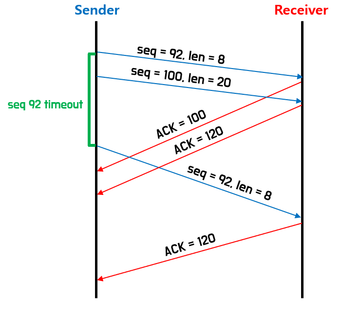 example 3과 같이 중간에 패킷이 유실된 경우 TCP는 cummulative ack이기 때문에 계속해서 ACK 92를 보낸다. timeout이 발생하고 나면 유실된 패킷이 재전송된다.