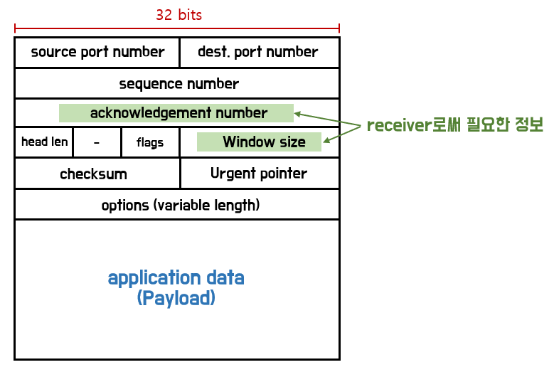 아래 그림의 TCP header에서 볼 수 있는 window size 값은 receiver 입장에서 수용 가능한 window 크기를 상대방에게 알려주는 것이다.