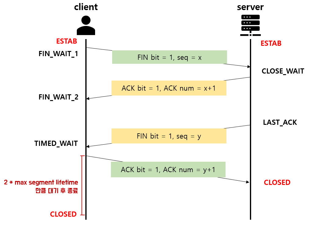 - 클라이언트도 maximum segment lifetime * 2 의 시간 후에 CLOSED 상태로 바뀐다. 이렇게 여유 시간을 두는 이유는 4단계의 ACK이 제대로 가지 않았을 경우를 대비해서 여유를 두는 것이다.