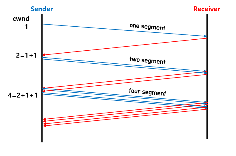 slow start는 아래 그림과 같이 처음 cwnd값을 1MSS로 시작하여, 매 RTT마다 cwnd값을 두배로 증가시키는 것이다.