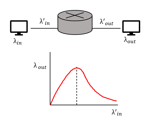 아래 그림에서 라우터의 input link로 들어가는 패킷의 양이 증가함에 따라 output link로 나가는 패킷의 양은 그래프와 같이 나타난다. 그래프에서 가장 최대값 지점을 찾는 과정이 congestion control이라고 보면 된다.