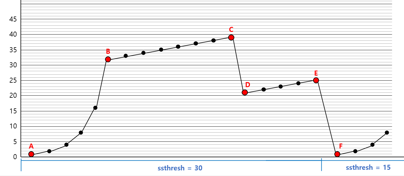 아래 그림에서 C-D 구간은 유형 1(duplicated ACK)에 해당하는 것이고 E-F 구간은 유형 2(timeout)에 해당하는 것이다.