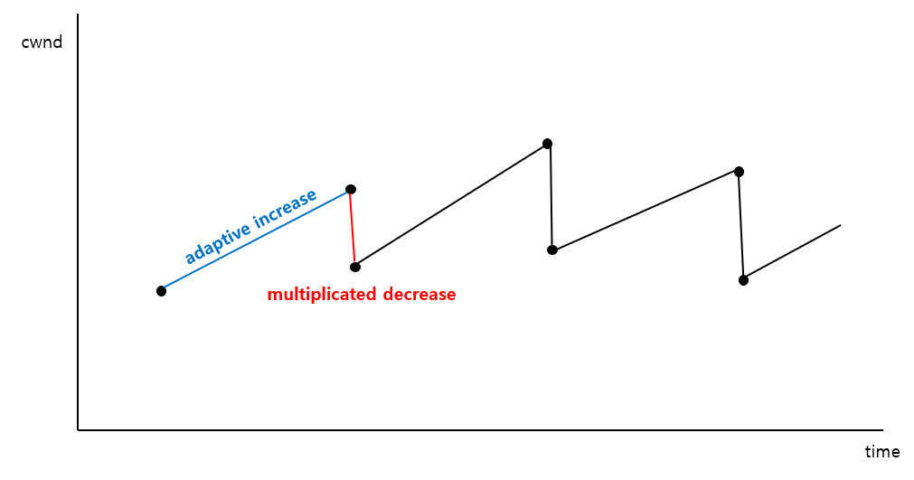 아래 그림과 같이 패킷 loss가 발생하지 않는다면, 점진적으로 cwnd값을 증가시키다가, 만약 loss가 감지되면 cwnd값을 반으로 확 줄이는 방식이다.