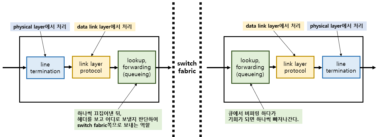 input ports에서, fabric으로 포워딩해주는 속도가 datagram이 도착하는 속도보다 느리면 buffering이 발생한다.