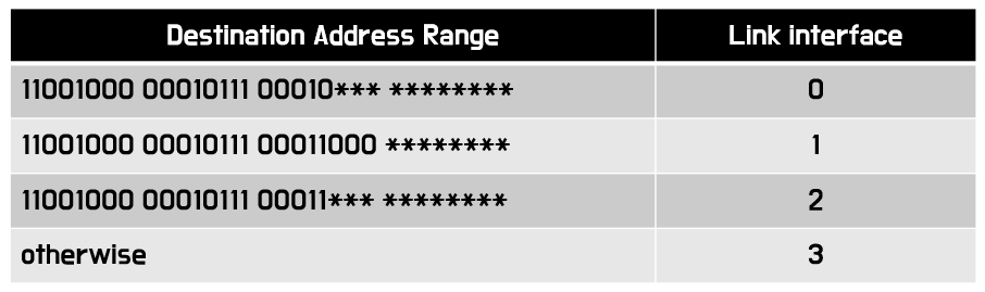 예를 들어 위의 forwarding table에서 "11001000 00010111 00011000 10101010" 주소를 가진 datagram은 prefix가 가장 길게 일치하는 1번 link를 통해 빠져나갈 것이다.