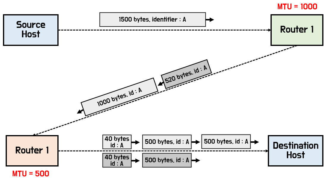 1500bytes 짜리 datagram이 있으며, MTU가 1000bytes, 500bytes인 link를 지나간다고 가정해보면, 아래 그림과 같이 fragmentation이 진행될 것이다.
