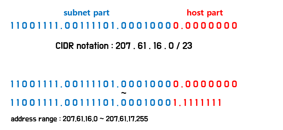 CIDR은 위와같이 표시를 하는데 / 뒤의 x값이 subnet 부분의 비트수를 나타낸다.