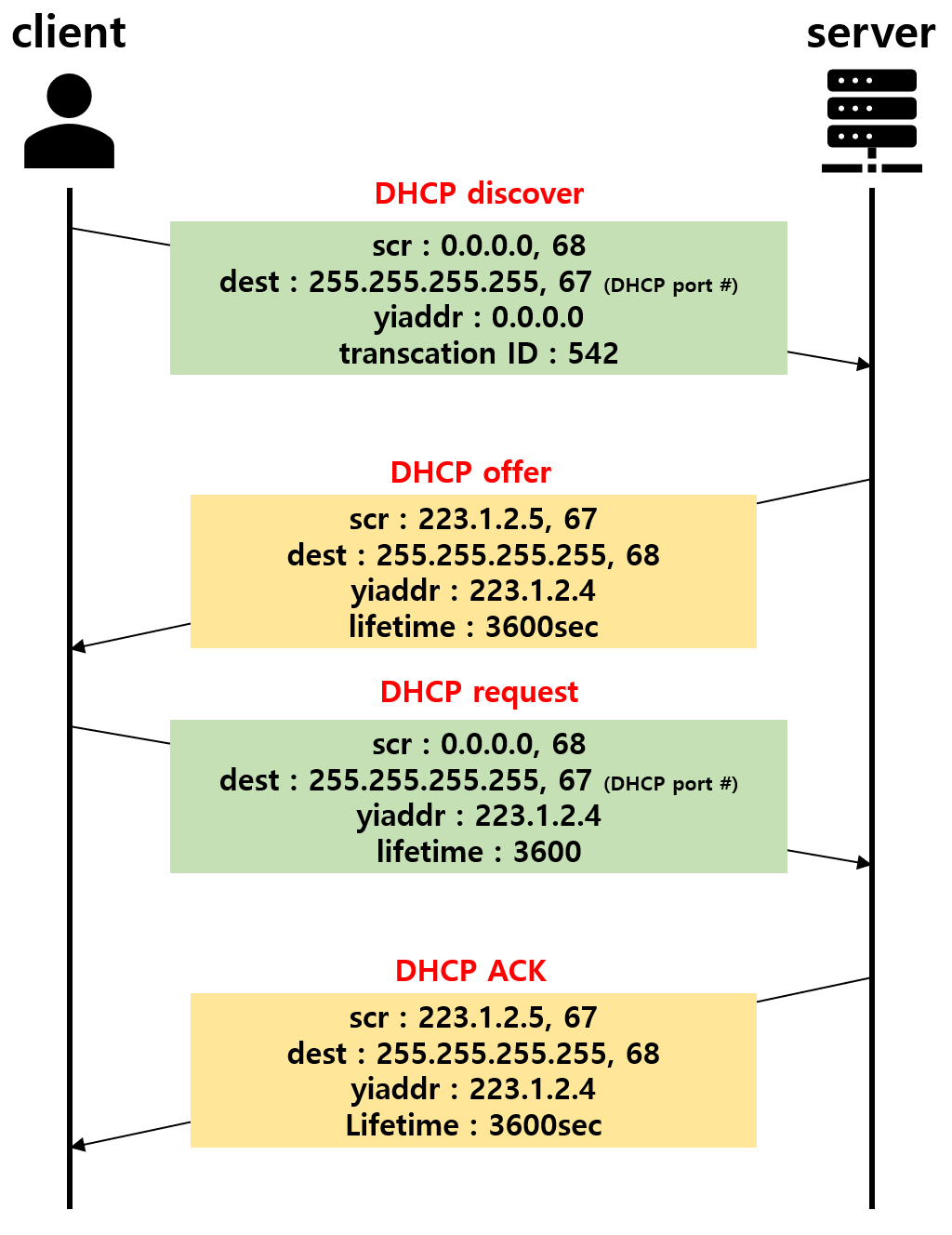 즉, 호스트는 우선 DHCP 서버를 찾고, 해당 서버로부터 사용 가능한 IP 주소를 받아와 쓰는 것이다.