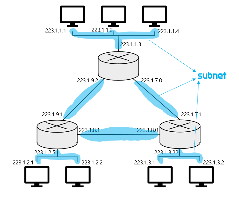만약 223.1.1.0 / 24 로 표현된 주소의 경우, 223.1.1의 24비트가 subnet 주소이고, 나머지 8비트가 host 주소이다.