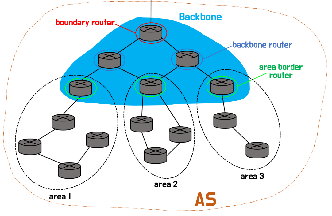 - backbone routers : 서로 다른 area를 연결하는 뼈대 역할을 하는 라우터