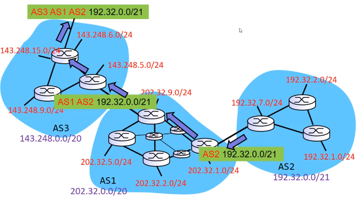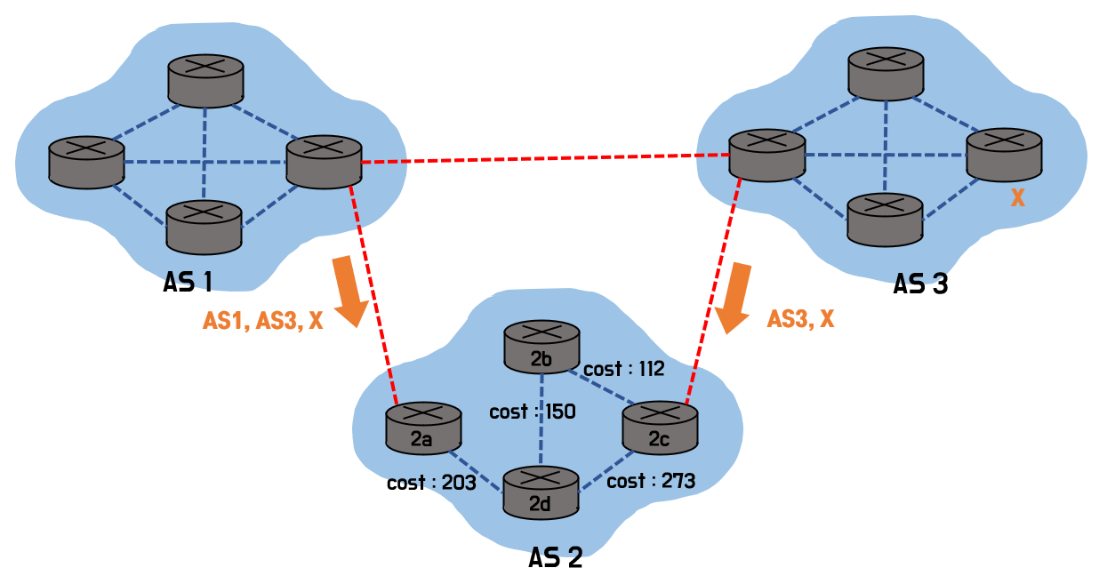 하지만, BGP 메시지를 주고받는 와중에, Intra-AS 프로토콜인 OSPF나 RIP를 통해 해당 AS 내의 모든 라우터들이 다른 AS에 존재하는 IP 주소를 서로 공유하고, 경로를 설정하게 된다.