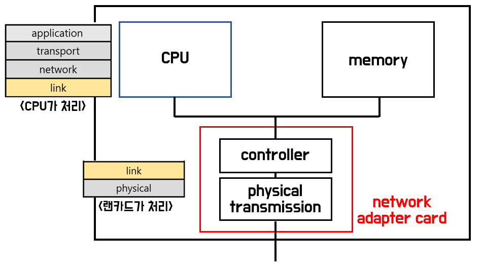 그래서 link layer도 OS 커널에 구현되어 있는데, OS 뿐만 아니라, 네트워크 카드에도 일부 구현되어있다다.