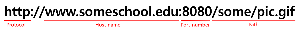 웹 페이지는 HTML file + referenced object 로 이루어져 있는데, 이 때 각 object들은 URL을 통해 reference 되는 구조이다. 여기서 URL이란, Uniform Resource Locator의 약자로 아래 그림과 같은 구조로 이루어져 있다.